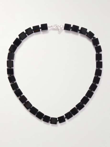 Le Sundial reimagines traditional jewelry through a bold, sculptural lens. Handmade from cord, this necklace is strung with square onyx beads and fastens with a silver clasp inspired by the Art Deco era. We think it looks best worn solo.