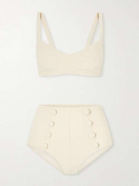 Lisa Marie Fernandez's bikini is made from seersucker – the puckered texture looks pretty and makes it dry faster. This set has a simple top and high-rise briefs inspired by retro swimwear.