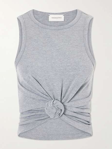 Magda Butrym tank top is cut from soft jersey with a high neckline and a close, sleeveless silhouette. It’s gently gathered at the front and finished with a knot detail that creates subtle drape. Style it with high-rise jeans or tailoring.