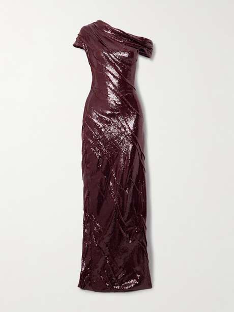 Cut from crepe adorned with gleaming sequins, Marmar Halim's gown features a one-shoulder neckline with elegant ruching that highlights your figure. Style it with minimalist heels and sleek jewelry.