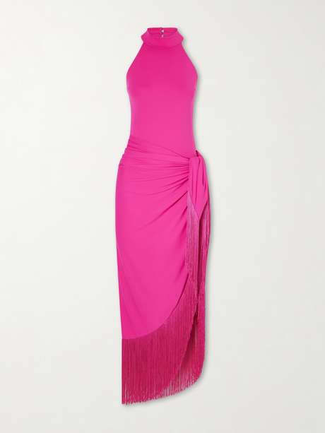 Taller Marmo's ‘Knossos’ swimsuit is crafted from stretch fabric in a halterneck silhouette with a high-cut leg and open back. Made in Italy, it comes with a detachable long pareo finished with contrasting fringed trims that add fluid movement.