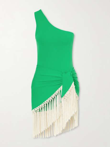 Taller Marmo's ‘Yacare’ swimsuit is crafted from soft stretch fabric and designed with a one-shoulder silhouette. It comes with a coordinating pareo, finished with hand-tied fringed detailing that adds movement and texture. Made in Italy, it offers a fluid, sculptural take on poolside dressing.
