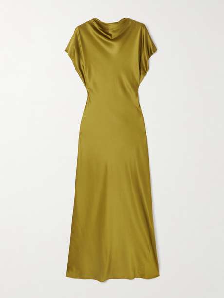 Veronica Beard's 'Redgrave' dress is made from moss-colored silk-blend satin that's cut on the bias for an effortless drape. It has floaty cap sleeves that frame the cowl neckline and cinches in gently at the waist before flaring out to a floaty hem.
