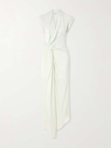 Victoria Beckham's maxi dress is beautifully draped and twisted through the bodice to highlight the waist. Made from satin, it has an alluring plunging neckline and asymmetric hem. Wear yours with sandal heels.