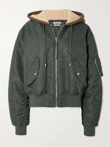 Hooded padded shell and shearling bomber jacket