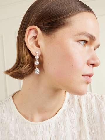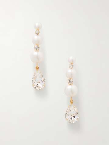 Gold-pleated, crystal and pearl earrings