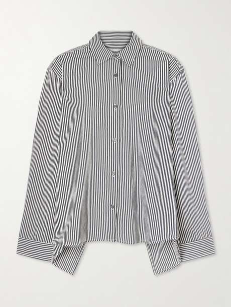 AGOLDE's 'Theo' shirt is cut from lightweight poplin in a striped pattern. It has a relaxed fit with a cape-like effect that drapes softly, leaving part of the back bare, and features a slim strap to adjust the fit.
