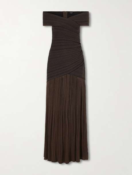 Balmain blends bold structure with fluid, feminine movement in this maxi dress. Made from lustrous knit, it has a fitted off-the-shoulder bodice that flows into a softly draped skirt, creating elegant motion and a dynamic silhouette. Pair with strappy heels and minimal accessories to let the pleats and luxurious knit shine.