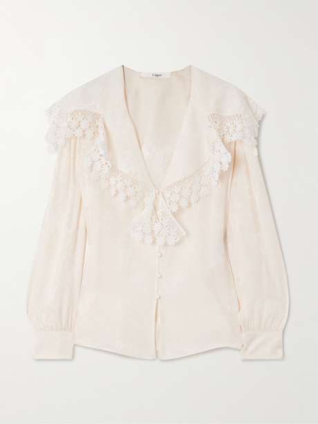 The beauty of Chloé's blouse lies in its crochet-trimmed sailor collar, which drapes charmingly over the shoulders. It's made from organic silk-jacquard subtly woven with blossoms in a mix of matte and shiny finishes.