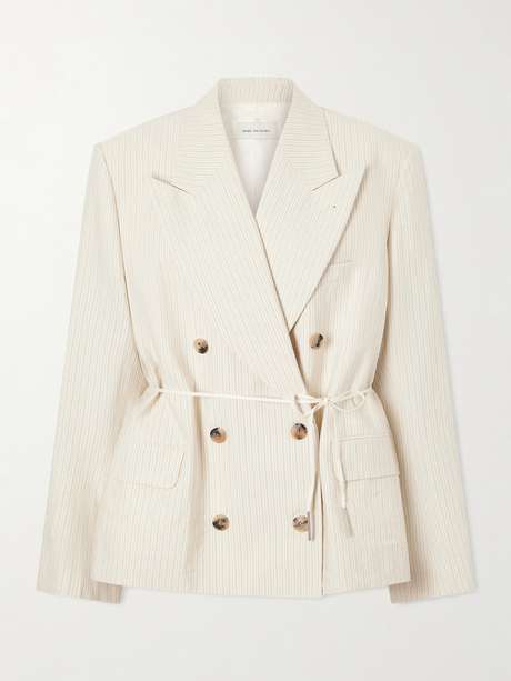 Dries Van Noten reimagines classic tailoring with subtle femininity. Made from cotton crepe with fine pinstripes, the 'Bosea' double-breasted jacket is cinched with a slender tie at the waist. Style yours with a mini skirt and boots.