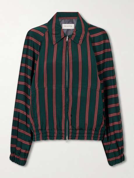 Graphic stripes and fluid tailoring define the 'Vinnia' bomber jacket by Dries Van Noten. Cut from lightweight fabric, the relaxed silhouette features a pointed collar and two-way zip. Deep green is animated by rust stripes, while elasticated cuffs and hem subtly shape the design.