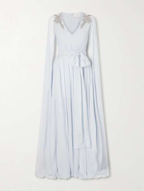 Erdem's gown is worthy of a modern fairytale. Cut from lightweight silk-crepon in the label's 'Porcelain Blue', it has a V-neckline and a self-tie that wraps around the waist. Cape sleeves sweep the shoulders and are scattered with radiant crystals on the shoulders.