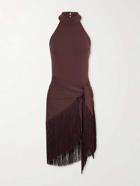 Taller Marmo's ‘Artemis’ set includes a swimsuit and coordinating pareo. Cut from stretch fabric, the swimsuit is designed with a halterneck, while the pareo is finished with fringed detailing that moves fluidly with each step.