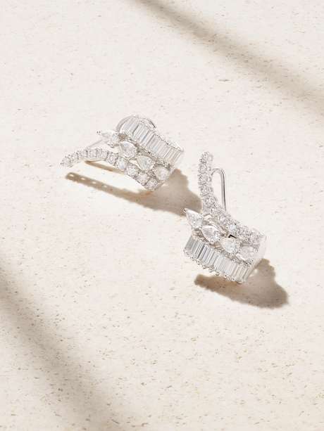 YEPREM's exquisite earrings create the illusion of a triple stack that stretches across your lobe. They're cast from 18-karat white gold and encrusted with 3.57-carats of pear-, baguette- and round-cut diamonds.
