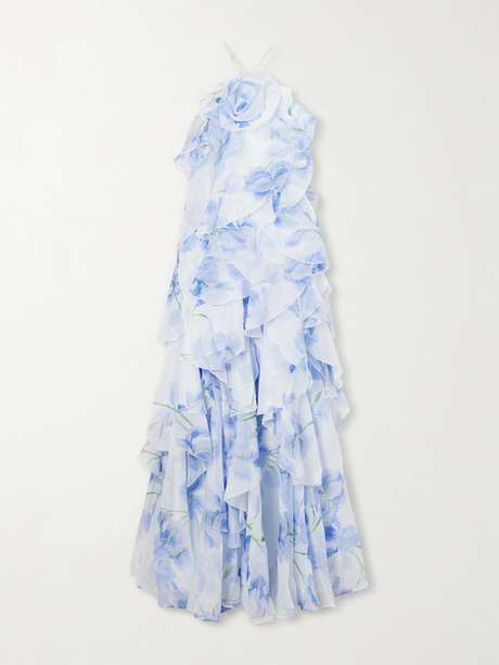 Aje's 'Pandorea' gown makes a statement with its voluminous silhouette, with tiers of soft ruffles that cascade along the bodice and floor-sweeping hem. It's made from crisp organza and appliquéd with a large flower at the neck. Adjust the metal-tipped ties at the back for a comfortable fit.