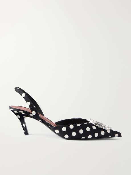 Amina Muaddi embraces playful fashion without compromising on craftsmanship. The 'Camelia' slingback pumps are crafted from satin in a fun polka-dot pattern and feature an elongated pointed toe with 60mm kitten heels. A mirrored crystal embellishment at the front adds a sparkling, statement-making touch.
