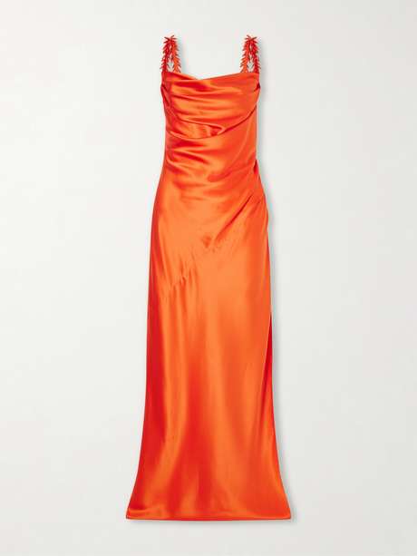 A study in movement, this Balmain dress is crafted from fluid silk that gathers into continuous draping across the body. The neckline remains deliberately undone, while the embroidered straps introduce a point of tension, holding the silhouette with ornamental precision.
