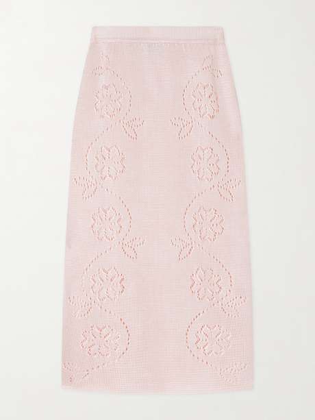 Calle Del Mar's skirt falls to a midi length with delicate blooms embroidered in vertical lines. Style it with the matching cardigan.
