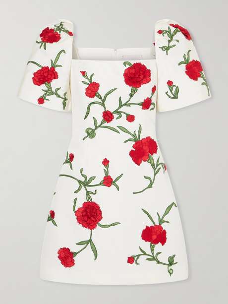 Carolina Herrera's mini dress is crafted from silk faille and detailed with geranium patches throughout. Slightly puffed sleeves add soft structure to the silhouette.