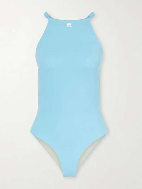 Courrèges reimagines the one-piece through graphic cut-outs and adjustable buckle straps. Crafted from stretch fabric for a close fit, it’s punctuated by the house’s AC logo—balancing function and futuristic edge.