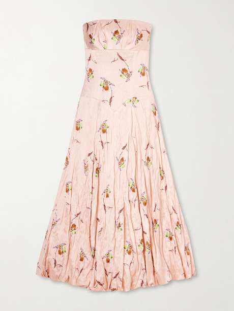 Emilia Wickstead's 'Kaia' dress is cut in a fluid pink viscose satin with a softly crinkled finish and delicate floral print. The structured bodice gives way to a voluminous gathered skirt with a bubble hem, balancing definition with movement.