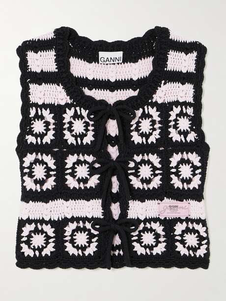 GANNI's cardigan is crochet-knitted from organic cotton in a bold floral pattern. Traced with scalloped trims, it has a relaxed shape and an open front that fastens with a trio of dainty ties.