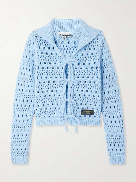 GANNI's cardigan is knitted from a blend of organic cotton and 50% recycled materials in an open, airy construction. It's designed with a dramatic ribbed collar and four self-tie bows down the front to adjust the fit. The logo appliqué features the 'please recycle' motto.