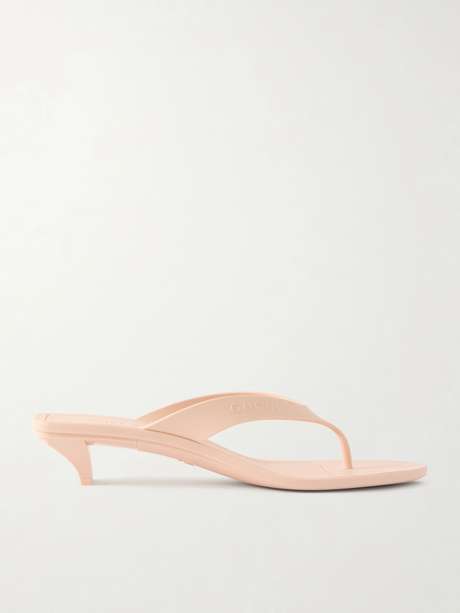 Gucci’s thong sandals are a comfortable, versatile staple for long walks on warm days. Crafted from rubber, they feature a minimal design with round open toes and slight heels for ease of wear, while the embossed lettering logo on the strap adds a signature touch.