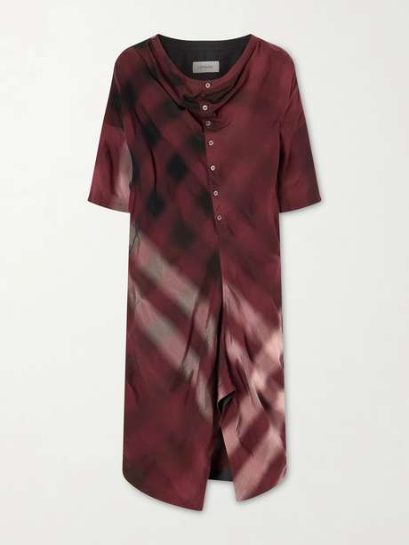 Lemaire’s dress is cut for a loose fit in a shirt-like silhouette, with an asymmetric cowl neckline that can be worn fully fastened or left unbuttoned. It’s crafted from printed jersey in a check and weave-inspired motif for added texture and movement.