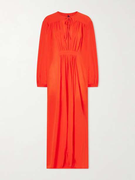 The vivid coral hue on LES VACANCES D’IRINA’s ‘Hazy’ dress heightens its sunlit ease. It’s cut from airy cotton and gathered through the neckline and waist to create a fluid maxi silhouette with blouson sleeves and a tie fastening that can be left loose.