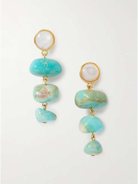 Twin sisters and founders, Kathryn and Lizzie Fortunato have a shared love of making and creativity. These 'Old World' earrings have gold-plated settings with a lustrous mother-of-pearl stud and three turquoise drops. They're just the right length to gently graze your jawline.