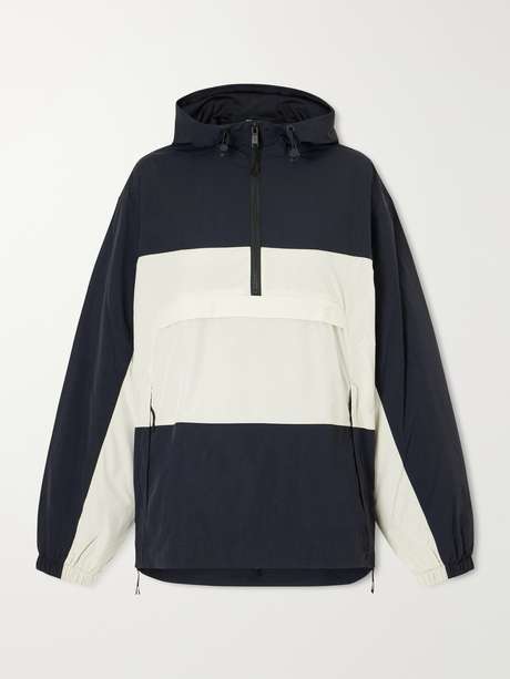 ON's jacket is crafted from shell in a bold two‑tone palette. It has an adjustable hood and hem cords, allowing a closer fit.