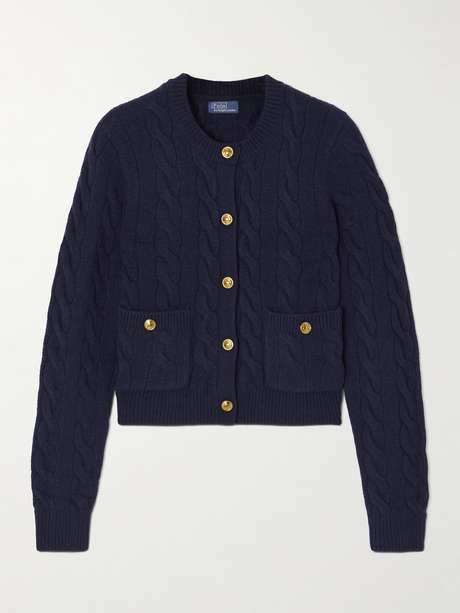 Polo Ralph Lauren's cardigan is made from wool and cashmere-blend and has a chunky cable knit. Ribbed trims trace the collar, pockets, cuffs and hem, while engraved gold-tone buttons add to its classic feel. Wear yours solo or open over a tee.