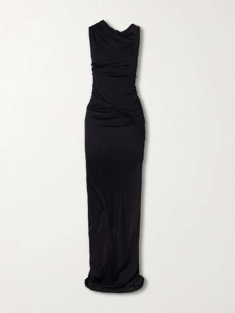 Rick Owens’ 'Shailee' gown showcases the designer’s sculptural approach to eveningwear. Cut from fluid jersey, it features a close fit with an asymmetrical draped neckline and a gathered waist that creates soft pleats. The skirt falls to a floor-length hem with a dramatic train—perfect styled with towering heels.