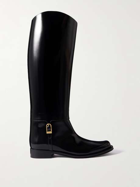 SAINT LAURENT's 'Julia' knee boots are a chic take on equestrian styles. Made in Italy from smooth leather, they have square toes and logo-engraved gold-tone buckles decorating the sides.