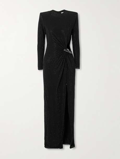 Self-Portrait's dress is so glamourous. Made from mesh, it's scattered with glinting crystals and has a gathered cutout at the side that's anchored with a crystal-embellished chain. It also comes with removable shoulder pads for that '80s effect.
