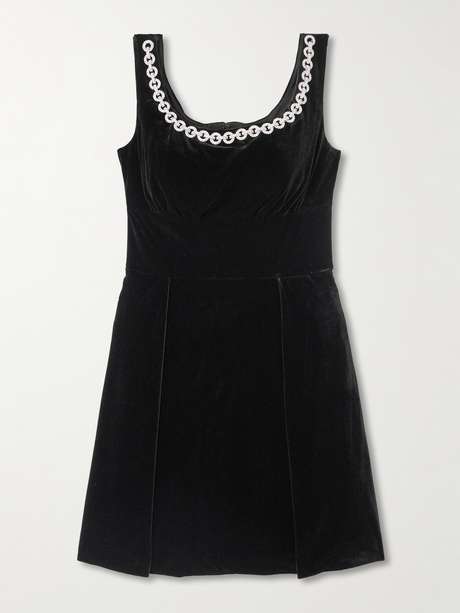 Self-Portrait's dress has a wide, square neckline that's trimmed with a crystal chain. Cut from plush velvet, it has a fitted bodice and falls to a flared mini hem.