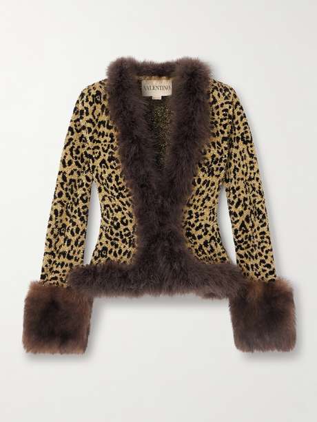 Valentino Garavani's cardigan was styled with the matching leopard-jacquard skirt on the Fall '25 runway. It's knitted from shimmering Lurex and trimmed with fluffy feathers that match the shearling cuffs