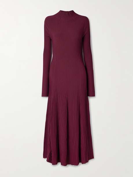 Adam Lippes' 'Tabitha' dress is made from ribbed-knit that fits close through the hips before falling to a flowy midi hem. It has an elegant mock neckline and streamlining seams. Complement the burgundy shade with gold jewelry.