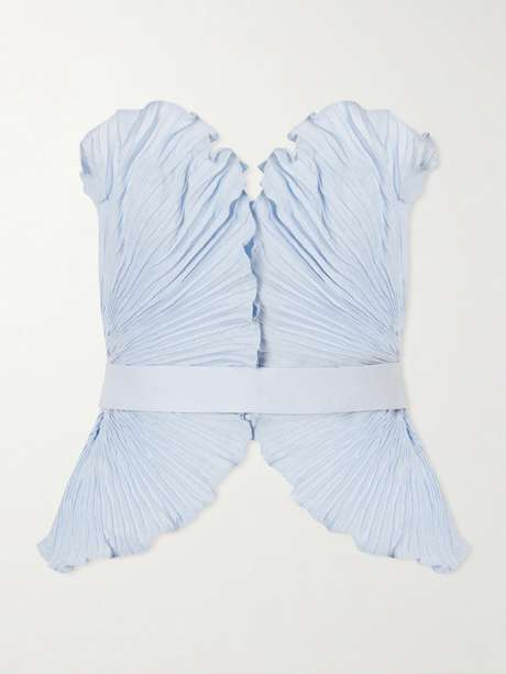 Andrés Otálora’s ‘De Tres’ top is designed to evoke the movement of waves. Crafted from crisp linen, it features a strapless, pleated bodice that flutters gracefully over the body. Pair it with a choker to highlight the strapless neckline.