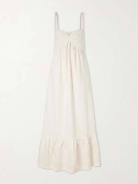 Andrés Otálora’s designs draw inspiration from his Colombian heritage. The ‘Tu Esencia’ maxi dress is crafted from lightweight linen, featuring a fitted bodice, embroidered with concentric curves, that flows into a maxi skirt finished with a slightly ruffled tier. Pair it with high heels and bold accessories for a polished, sophisticated look.