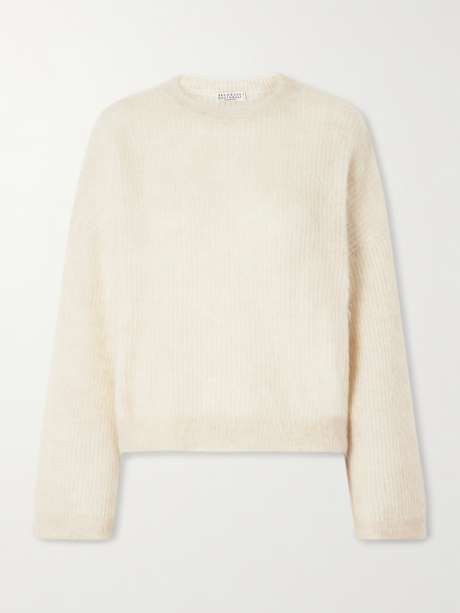 Brunello Cucinelli's fluffy sweater is knitted with touches of sumptuous mohair, wool and cashmere. It has a classic crew neckline and is ribbed throughout for light structure. Embrace the neutral look and wear it with the white jeans.