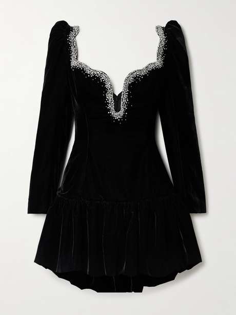 Unmissable occasions require a dress that's just as memorable. Made from black velvet, Clio Peppiatt's 'Edie' mini has a scalloped neckline that's illuminated with light-catching crystals and a voluminous bubble hem. Wear yours with point-toe pumps.