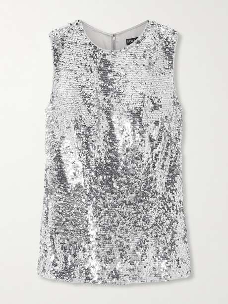 Dolce&Gabbana's top such a stunning choice for parties. It's cut in a sleeveless shape from satin and saturated with light-catching sequins. Contrast the silver tone with gold jewelry.