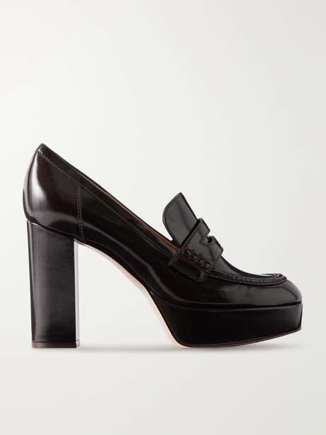The ‘Hadden’ pumps by Gianvito Rossi reinterpret classic loafers through a sculptural lens. Crafted from glossy leather, the design features a rounded toe and penny bar detail, set on a substantial platform and high block heel that shifts the silhouette from traditional to statement.