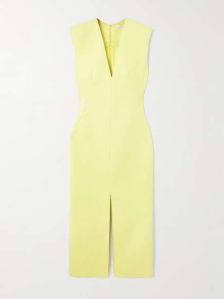 Givenchy's midi dress comes in an bright yellow shade that's sure to command attention. Made from wool, it has a V-neckline framed by structured shoulders and a center split that's mirrored at the back. The raw-cut edges lend an undone feel.