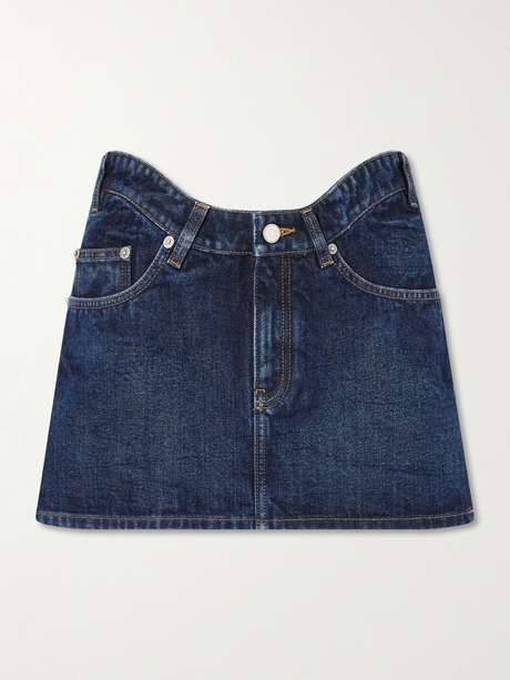 Debuting as Jean Paul Gaultier’s creative director, Duran Lantink infused the Spring ’26 collection with a bold, futuristic spirit. Crafted from sturdy denim, this mini skirt is designed with a sculptural curved waistband that nods to the house’s experimental approach to tailoring.