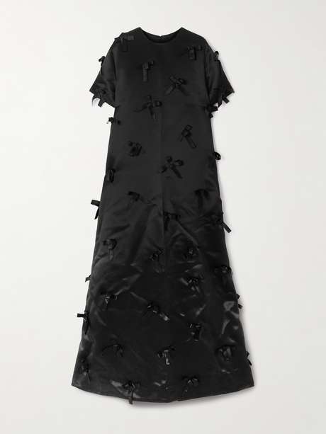 Jil Sander's maxi dress embraces dichotomy – it's effortless yet glamorous, dark yet feminine. Debuted as part of the Fall '25 collection, it's cut in an A-line shape from lustrous satin and embellished with pretty bows from the crew neckline down to the floor-skimming hem.