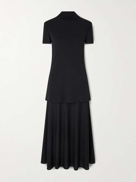 Jil Sander's midi dress has a sleek, layered design, so it almost resembles two pieces. Made from flexible jersey, it has a stand collar that ties at the nape and falls to a flowy skirt. Complete the look with knee-high boots.