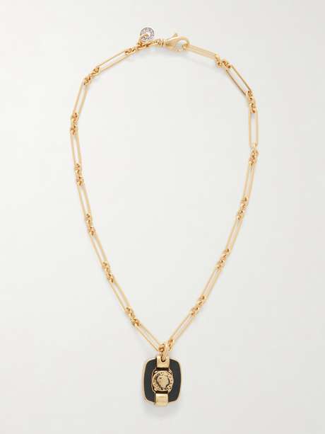 Maison Mayle’s 'Figura M' necklace strikes a balance between modern and vintage influences. Crafted from gold-tone metal, it features the brand’s rosette pendant with a slightly worn, cast-metal texture, set against glossy black enamel, and suspended from a sculptural chain.